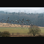 | 28.02.2009: Kraniche in Herschbach Am Vorabend kuendigte sich das Naturschauspiel bereits lautstark an, was ich dann versuchte, im Bild festzuhalten: In ca. einem Kilometer Entfernung pausierte ein für mich kaum fassbar großer Schwarm dieser beeindruckend großen Zugvoegel, die sich auf dem Weg in den Norden befanden. Gemaeß Literatur erreichen sie eine Groeße von bis zu 1,5 Meter, wiegen bis zu 12 Kilogramm und legen taeglich zwischen 300 und 800 Kilometer bei einer Geschwindigkeit von bis zu 80 Kilometern pro Stunde zurueck. Nach dem Fruehstueck machte ich mich auf dem Fahrrad mit meiner Kamera auf dem Ruecken auf den Weg, um die Tiere abzulichten. Tja, als ich ankam, waren die ersten "Gruppen" bereits abgeflogen. Das Material bestehend aus einem 70-200, einem 1,4-fach-Telekonverter und die von mir verwendete ISO-Zahl war leider unzureichend. Zudem herrschte an diesem Morgen Dunst, das Ergebnis ist entsprechend unbefriedigend für mich ausgefallen. So zeige ich an dieser Stelle nur zwei der gemachten Bilder, aus denen Sie aber vielleicht dennoch schließen können, wie viele Tiere "pausiert" haben und wie groß Kraniche tatsaechlich sind. |